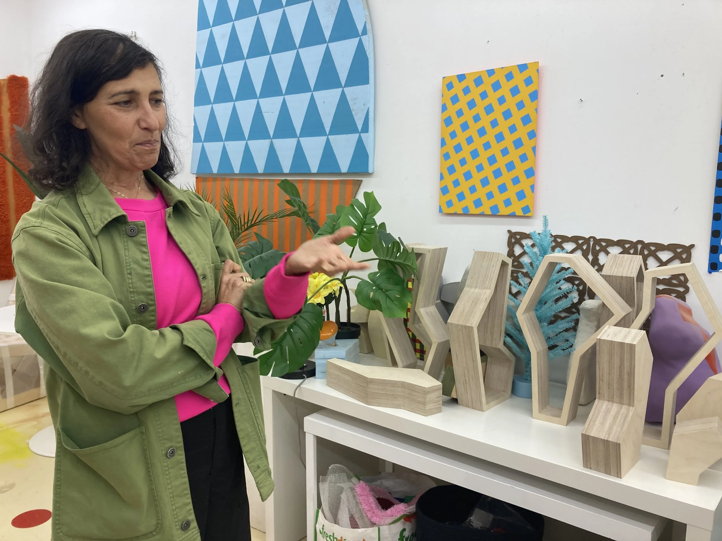 You will see the source of her ideas that manifest in colorful energetic forms. As she discussed her work, she talked about the way her forms are influenced by classical sculptures - legs, torso and head - reading and activating the real and illusioned space she creates.