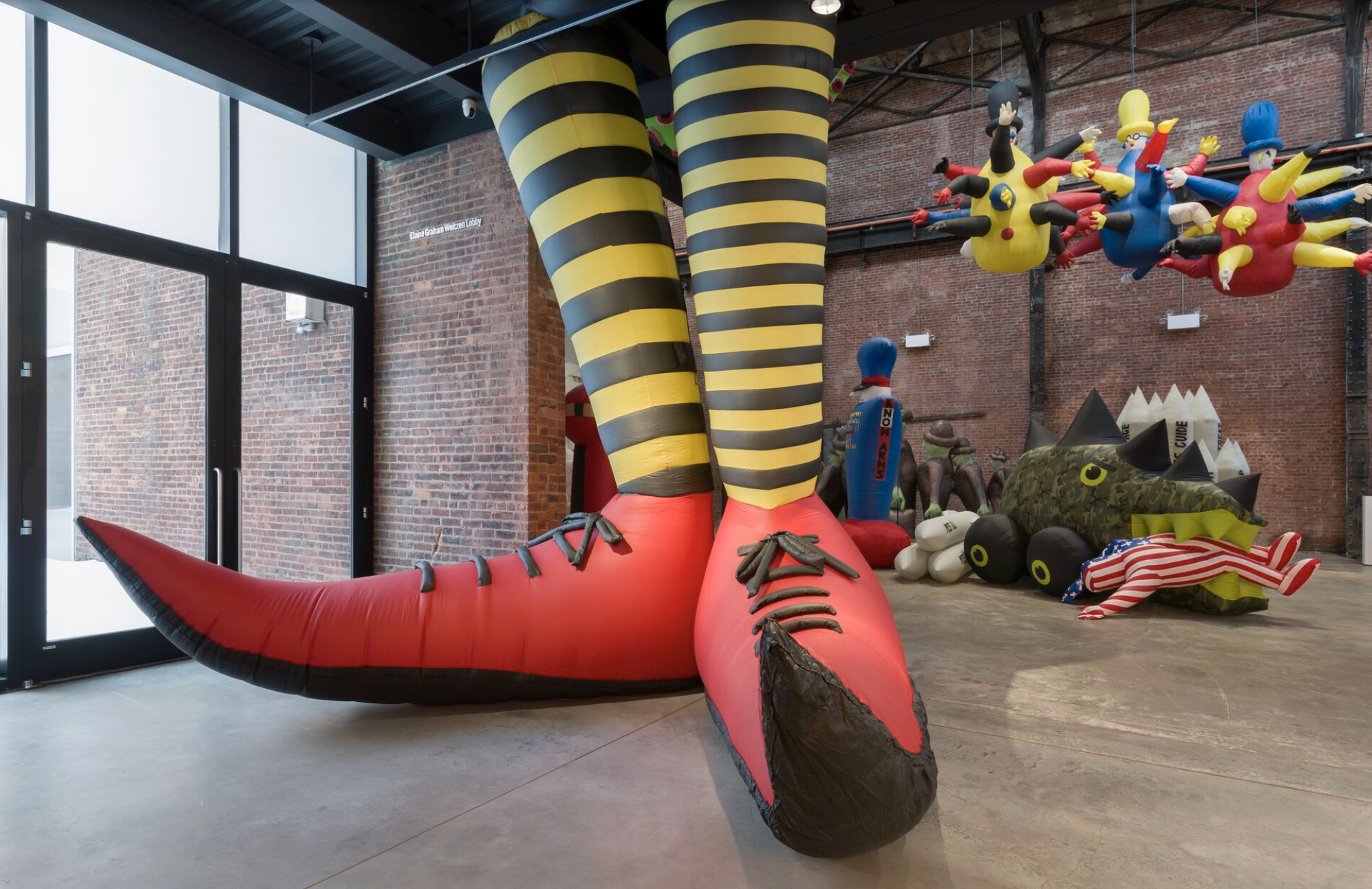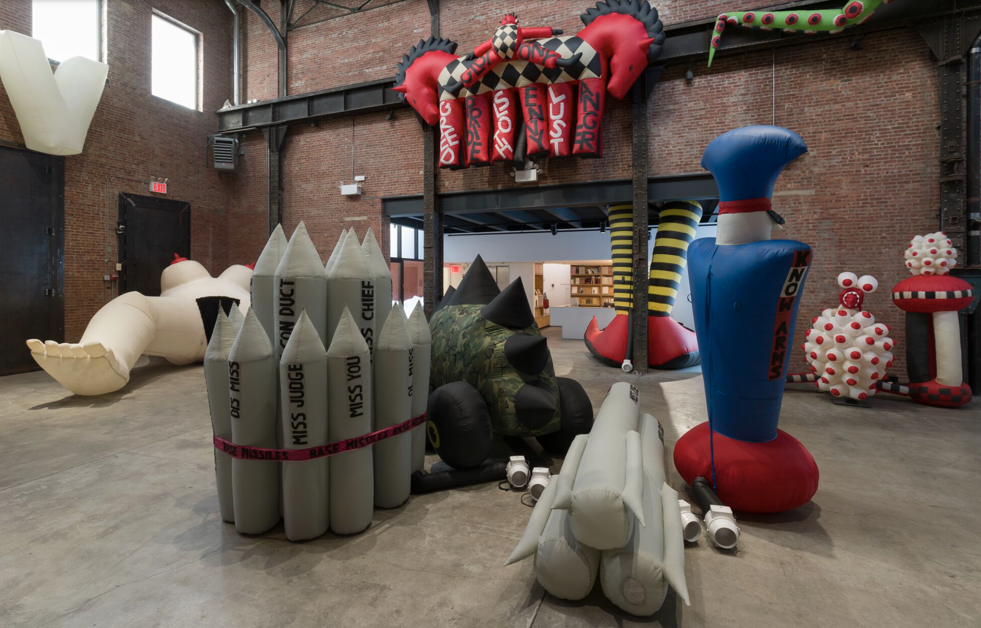 SculptureCenter presents the first solo exhibition in a New York City institution in over 35 years of Pat Oleszko. Rooted in humor, sharp social commentary, and the defiance of all forms of authority, Oleszko's sculptures lend themselves to raucous performances that use linguistic wit to address concerns about the state of the world. As her work developed, Oleszko devised some defining strategies: using her body, which led to costumes, and using air, which produced large inflatable works. In both cases, her art “walked out the door,” in her words, “using all the world as a stooge.”
